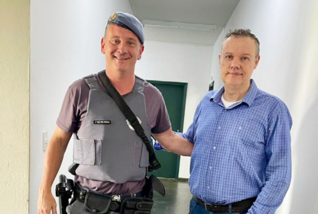 Dr. Cristiano France Favaro, novo Delegado de Polícia Titular de Tambaú, ao lado do Comandante da Polícia Militar 2º Sargento Diângeles Luiz Sossai.